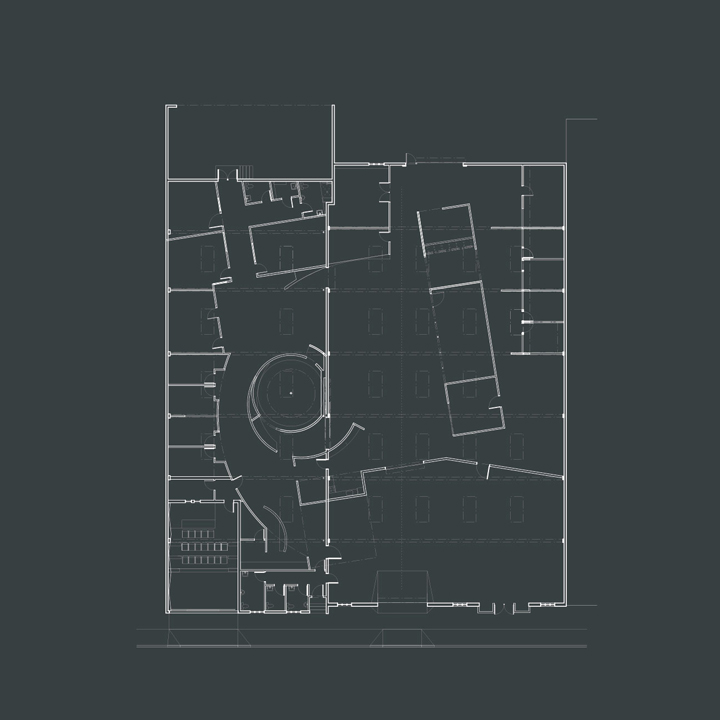 We introduced a circular conference room that becomes the vortex of the environment. It straddles the central dividing wall and propels into motion a series of ripples whose trajectories penetrate and diminish the separation while establishing auxiliary spaces for informal gathering.......more about the office interior